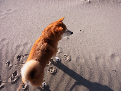 砂浜の向こうのほうに、何やら見つけたようです。